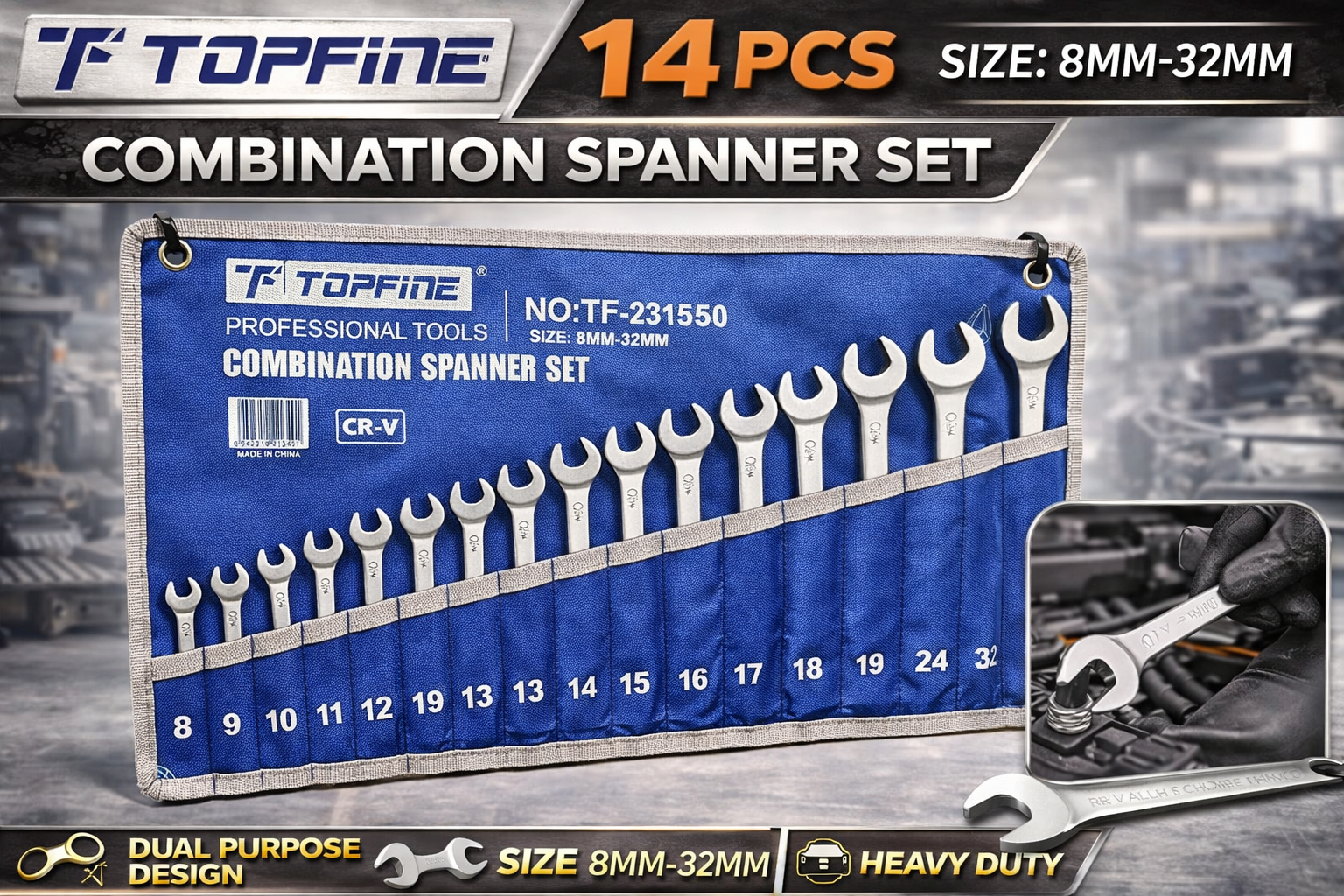 Handle a wide range of repair and maintenance tasks with this Topfine Professional Combination Spanner Set. This 14-piece metric set includes sizes from 8mm to 32mm, giving you the flexibility needed for both small and large fasteners.