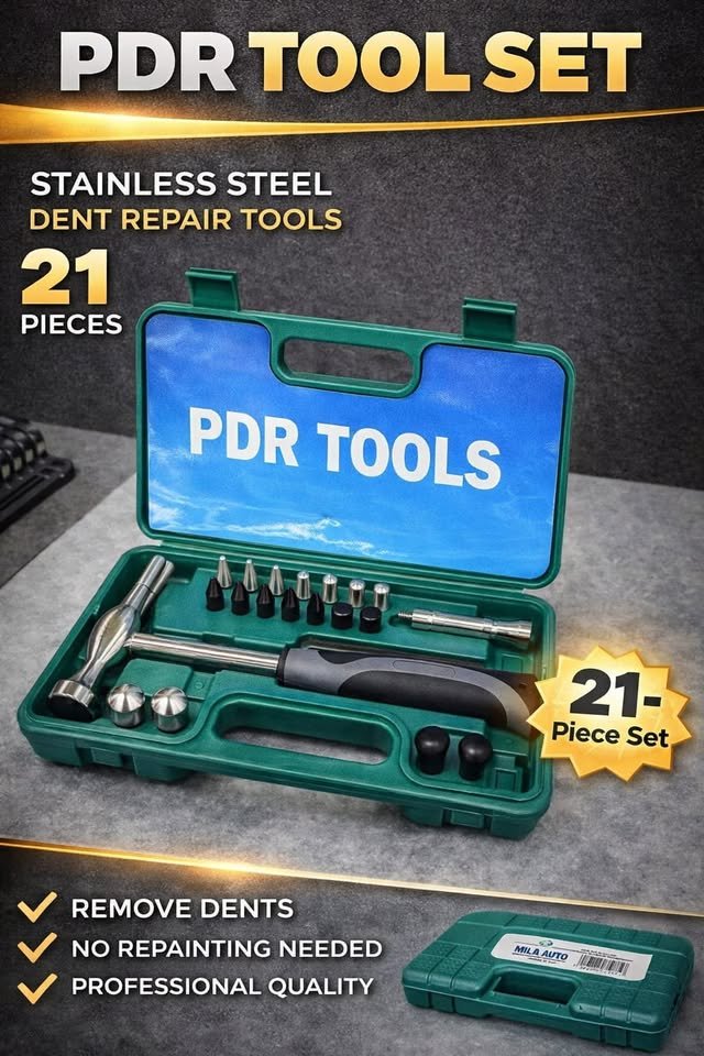 Professional 21-Piece PDR (Paintless Dent Repair) Tool Set designed for removing dents without repainting. This kit includes a stainless steel leveling hammer, multiple interchangeable tips, and durable carrying case — perfect for body shops and DIY dent repair.