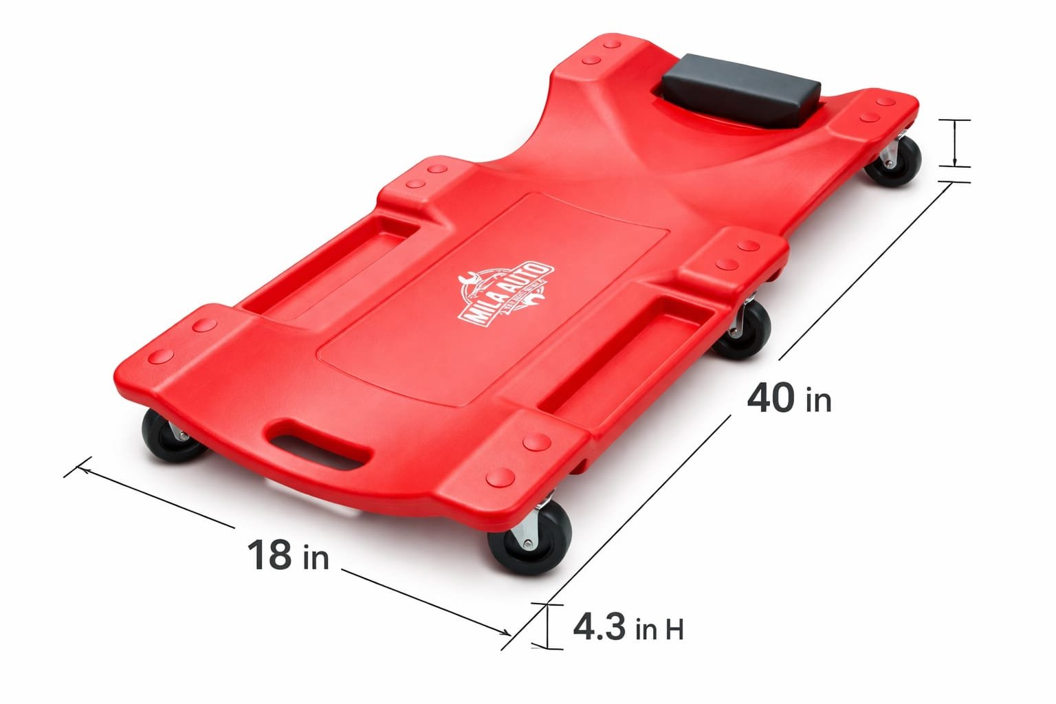 Work comfortably under vehicles with this heavy-duty 40″ mechanic creeper. Designed with a low-profile ergonomic shape, this creeper allows easy access under cars, trucks, and SUVs while providing solid support and smooth mobility. The durable molded construction and padded headrest keep you comfortable during long jobs, while built-in side trays keep your tools within reach.