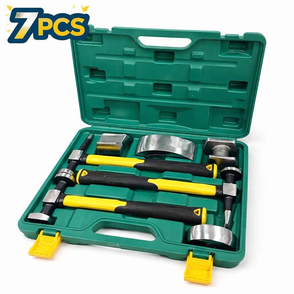 Professional 7-piece sheet metal hammer and dolly set designed for auto body repair, dent removal, and metal shaping. This kit includes three body hammers and four precision dollies, all organized in a durable carrying case for easy storage and transport.